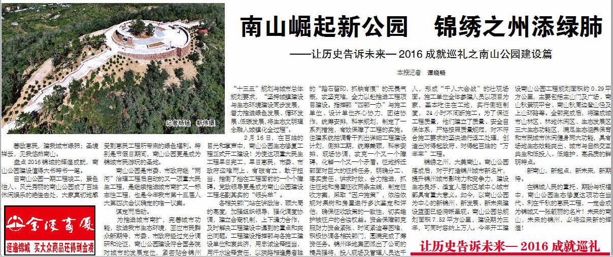 在錦城人民的重托、期盼與祝福中,南山公園生態(tài)修復(fù)這項功在當(dāng)代、利在千秋的惠民工程,一定會成為錦城又一張靚麗的名片!未來的南山,未來的錦州,必將迎來新的輝煌!